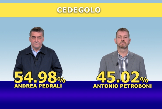 Il risultato delle urne di Cedegolo riconferma sindaco Andrea Pedrali che ha avuto 359 voti (54,98%) contro il 294 dello sfidante Antonio Petroboni (45,02%).