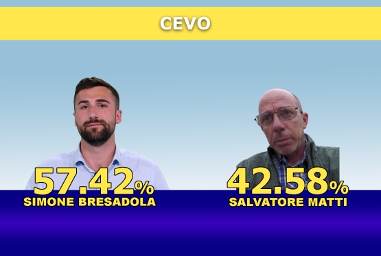 Cevo elegge Simone Bresadola in linea di continuà con l'amministrazione uscente. Bresadola ha avuto 325 voti (57,42%) contro i 241 dello sfidante Salatore Matti (42,58%).